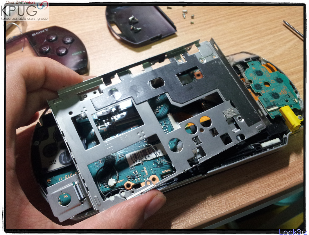 미들프레임을 분해합니다. UMD도어 스위치를 개방한 상태에서 분해해야 열립니다. UMD 걸쇠가 저 미들프레임의 일부분으로 사출되어있기 때문입니다.