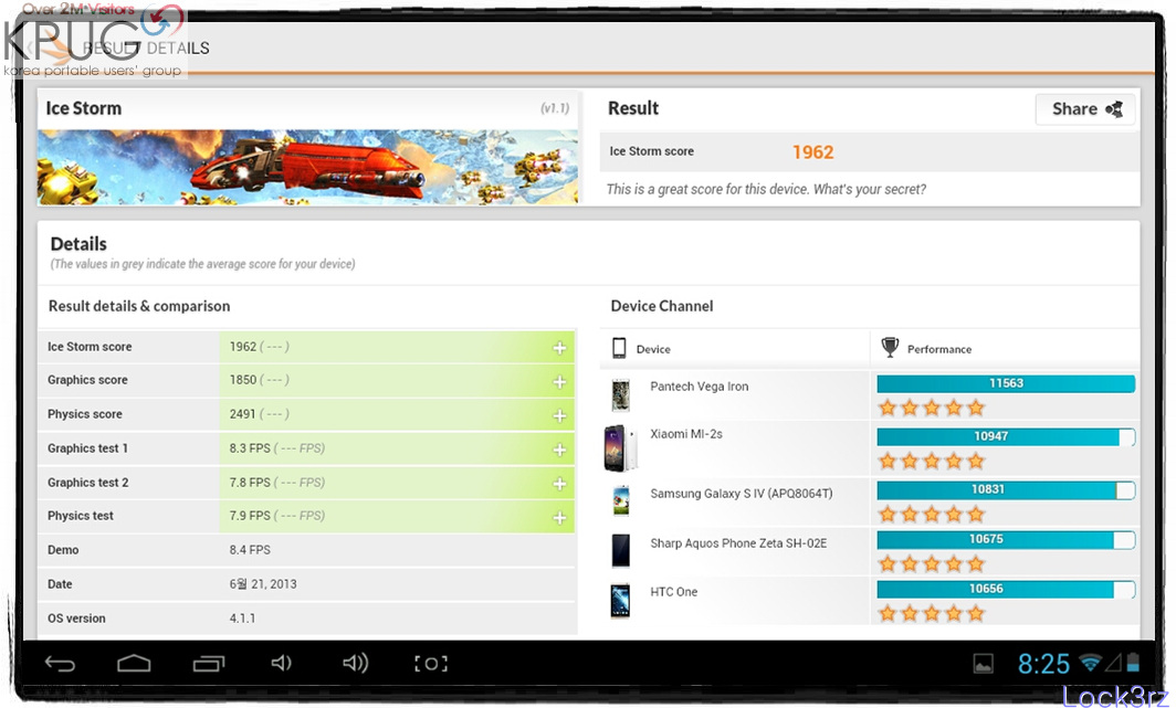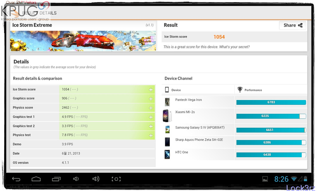 Antutu Benchmark는 실행후 테스트를 진행하는 도중 종료되어 정상적인 테스트를 진행할 수 없었습니다. 같은 기종을 리뷰하신 푸른솔님께서는 2.xx대의 낮은 버전의 Antutu Benchmark 앱으로 테스트를 진행하셨습니다. 5월20일자 펌웨어에서는 실행이 될지 모르겠습니다만, 5월 20일자 펌웨어를 올리면, 액정이 꺼짐과 동시에 기기가 종료되는 치명적인 버그가 발생하여 정상적인 사용이 불가능해 보류하였습니다. 다른분들은 Antutu Benchmark 도 잘 구동되고, 펌웨어업데이트 후 이상도 없는 듯 싶습니다만... 당최 오류의 원인을 알수가 없습니다. 다행히 20130412일자로 다운그레이드는 정상적으로 되더군요. 실행되는 분들의 의견을 종합해보면 1만3천점~4천점대의 벤치마크 점수를 보여줍니다. 하지만, 실제 퍼포먼스는 6~7천점대 정도 밖에 되지 않는 다고 말씀드리고 싶습니다. 5월 20일지 펌웨어에선 어떨지 모르겠습니다만, 4월 12일자에서 만큼은 '좀 빠른 싱글코어'정도의 퍼포먼스입니다.