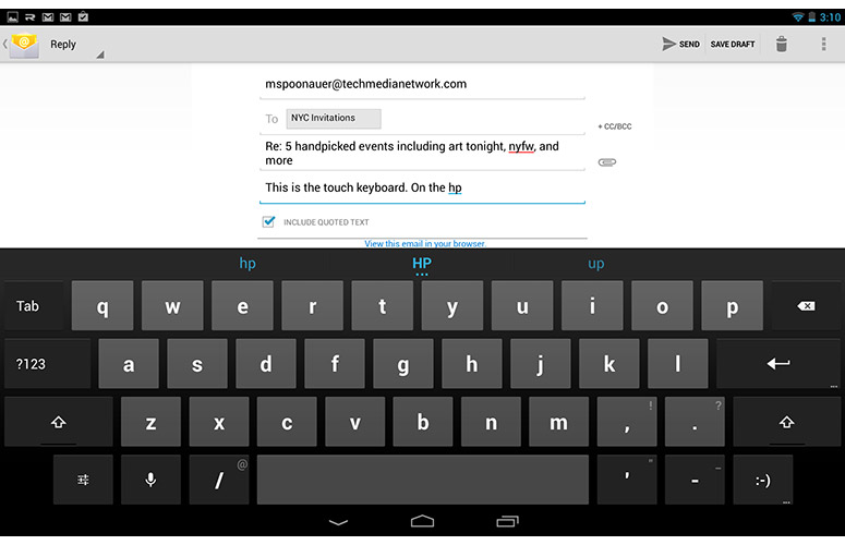 태블릿을 키보드 독에 결합한 상태에서 문자열을 선택하는 것은 매우 힘들었습니다. Windows나 OS X에선 클릭 후 드래그 하는 동작만으로도 문자열을 선택할 수 있었습니다. 하지만 이 기기에서는 선택할 영역을 두 번 두드린 다음에 정확히 원하는 영역까지 블록을 씌우기까지 여러 번의 시도가 필요했습니다. 다른 플랫폼의 기기에서는 쉽게할 수 있었던 일이 안드로이드에선 매우 귀찮은 일이 되었습니다.