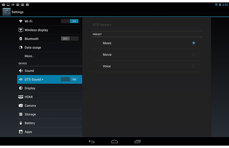 설정에서 DTS+를 활성화시키니 스테레오 스피커에서 괜찮은 양의 음량이 나왔습니다. 설정에서는 세 가지 음악 프리셋인 음악, 영화 그리고 음성 중 하나를 고를 수 있습니다.