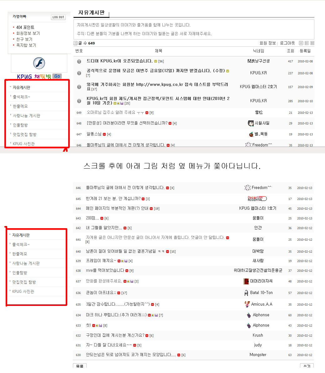 그러고 저장하고 메모장 닫으시고요. 다음부터 kpug.kr 에 방문하시면 왼쪽에 메뉴가 떠다닙니다.