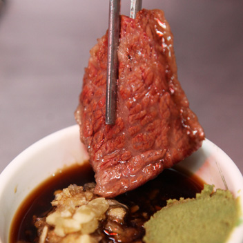 주인에게 와사비장을 달라고 해서 고기를 찍어 먹으면